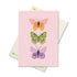 Die stabile Frühlingskarte aus Holzschliffpappe zeigt drei bunte Schmetterlinge. Sie ist wunderbar als Karte zum Muttertag oder oder zum Beschriften von Ostergeschenken.